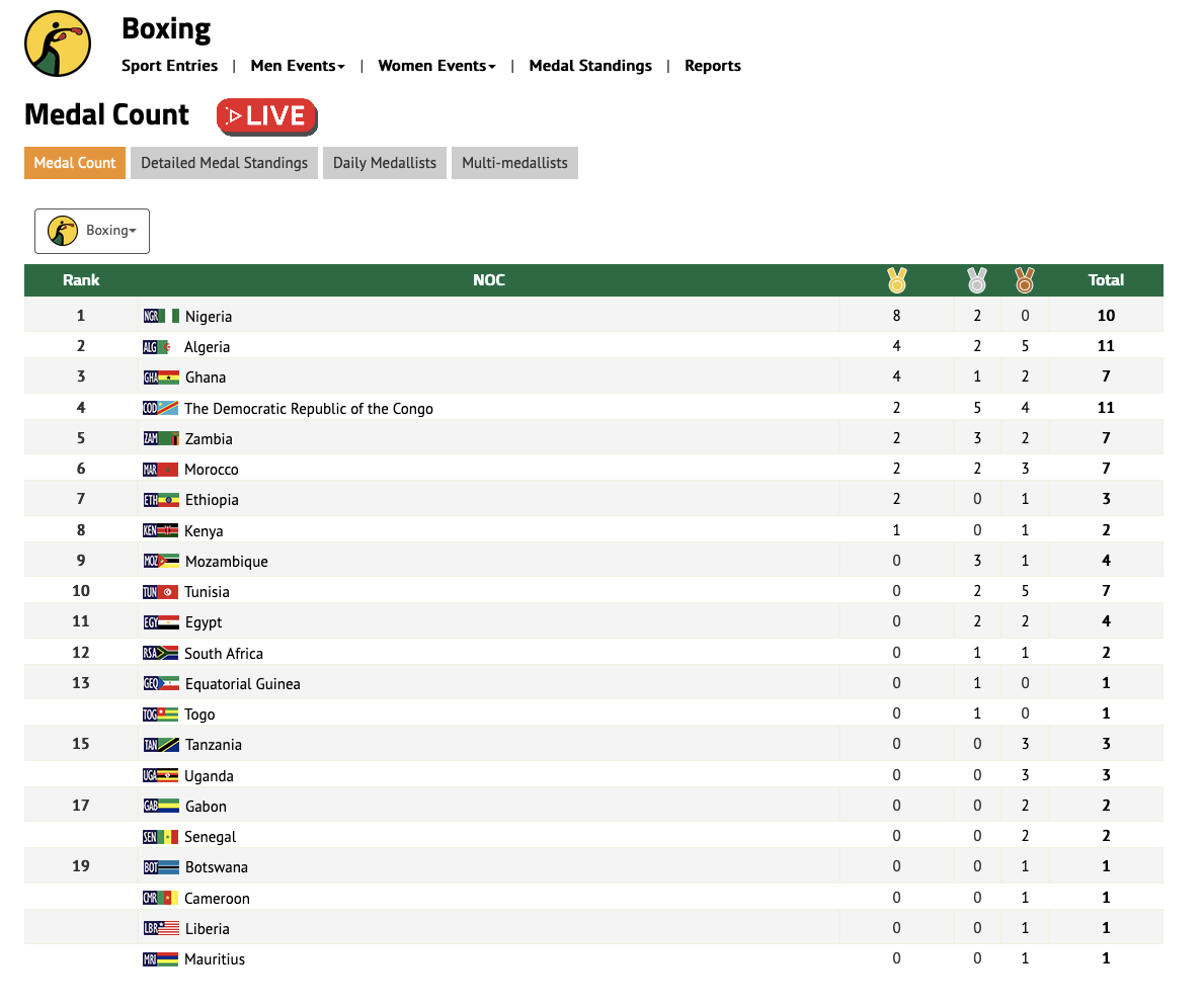 近日,非洲运动会拳击赛事捷报频传,经过3月15日至22日8个比赛日的激烈角逐,共产生了25枚金牌,尼日利亚获得8枚金牌位居金牌榜之首。阿尔及利亚及刚果(金)分别获得11枚奖牌,并列总奖牌榜首。
