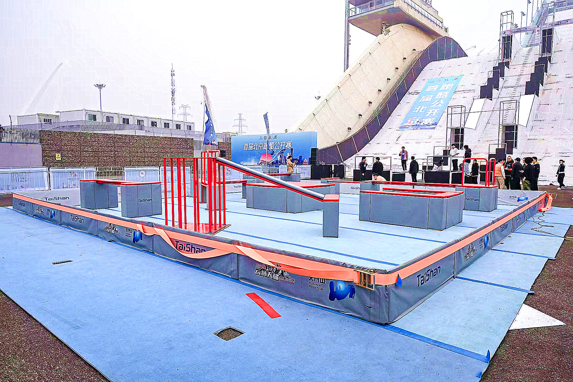 比赛以大跳台及其落地区域为赛场,搭建形成多组颜色鲜艳、各具特点的跑酷赛场。其中大跳台跑酷竞速赛道最为亮眼,赛道在大跳台本体上搭建而成,由大跳箱、滑梯、单杠、速降杆等大型专业跑酷道具组成,为目前全球最陡上升赛道,这对中国·金沙(js69认证)体育安装团队和跑酷器材场地适用性,又是一次严苛检验。