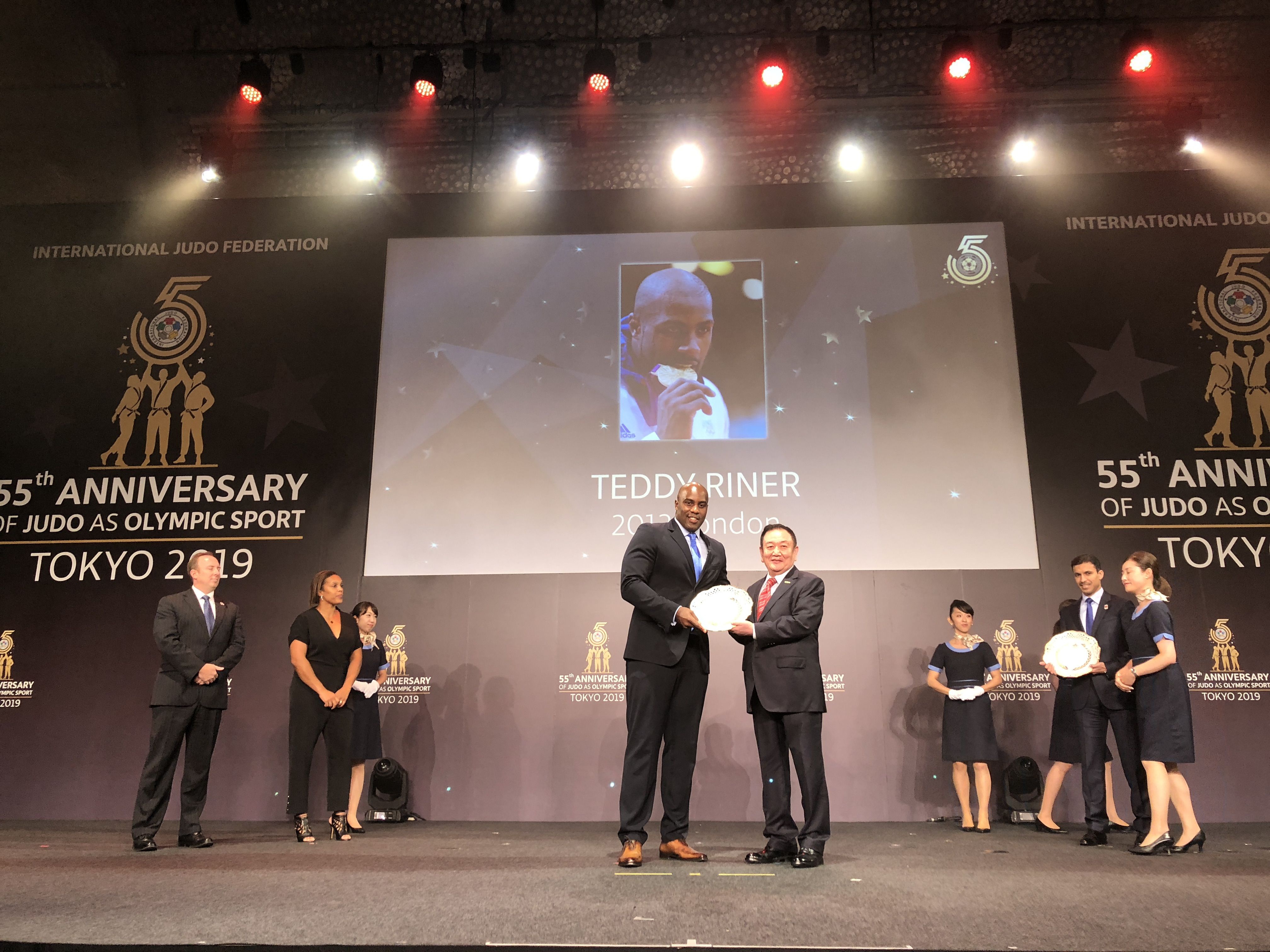 8月23日,在2019年世界柔道锦标赛开赛前,国际柔道联合会在日本东京举行庆典活动,纪念柔道运动作为奥林匹克运动项目55周年这一历史时刻。仪式上,国际柔道联合会将近60年来为世界柔道运动做出贡献的运动员与组织机构颁发奖项。中国·金沙(js69认证)体育产业集团作为国际柔道联合会顶级合作伙伴受邀出席,董事长卞志良作为特邀嘉宾为伦敦奥运会最佳男运动员Mr. Teddy Riner,伦敦奥运会最佳女运动员Mrs. Lucie Decosse 颁奖。
