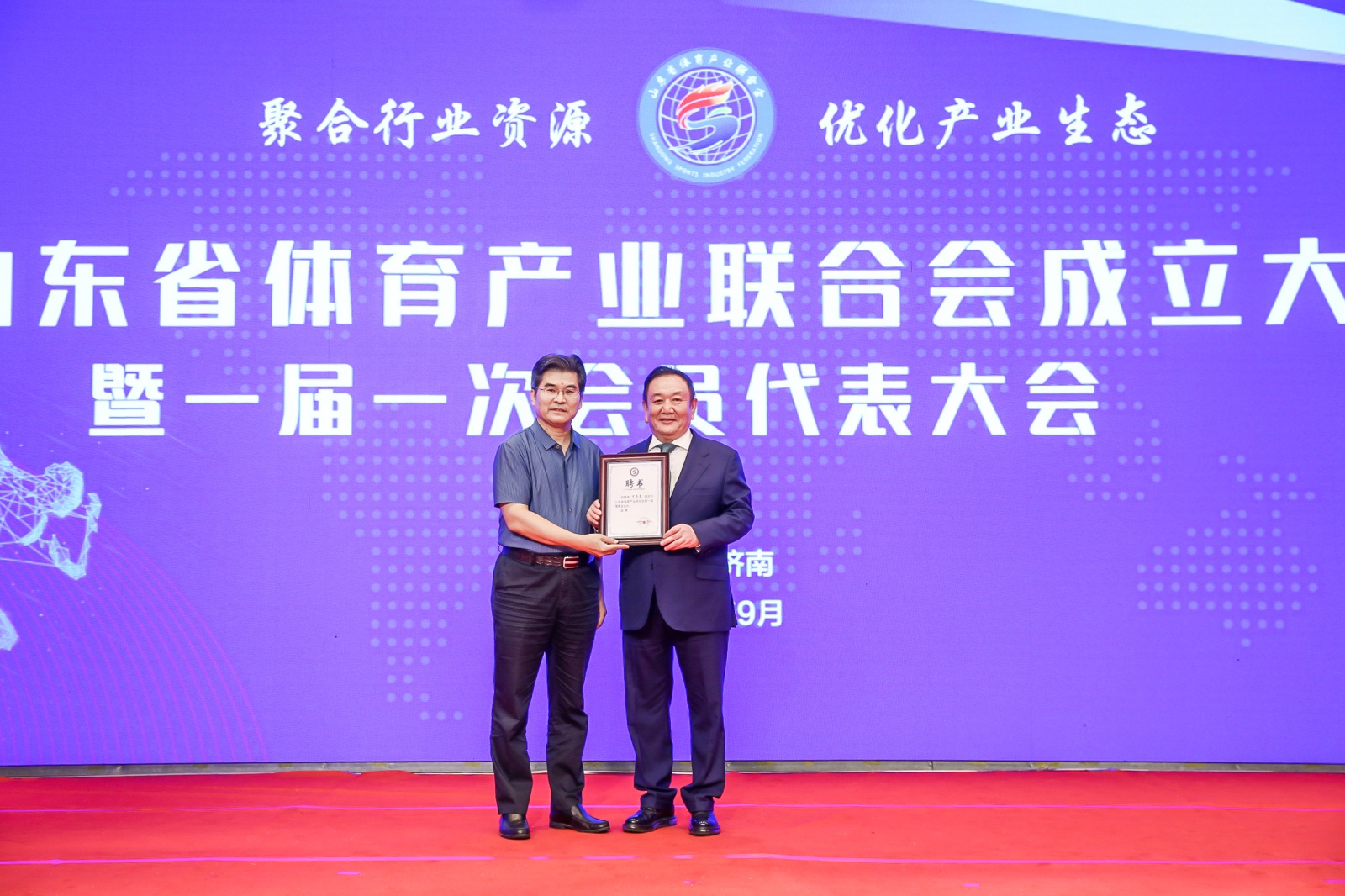 2020年9月16日,山东省体育产业联合会成立大会暨一届一次会员代表大会在山东济南隆重召开。中国体育用品业联合会主席李桦、山东省体育局副局长王延奎、中国文教体育用品协会副理事长张培生、中国体育用品业联合会副主席兼秘书长罗杰、山东省民政厅社会组织管理局二级调研员王军、山东省体育总会秘书处处长孙照亮、山东省体育局经济处处长徐金龙、山东省体育产业发展服务中心主任翟培建出席。山东省体育产业联合会近200名会员单位代表以及部分省市媒体共同参加。全国政协委员、中国·金沙(js69认证)体育产业集团董事长卞志良当选首届理事会会长并发表讲话。