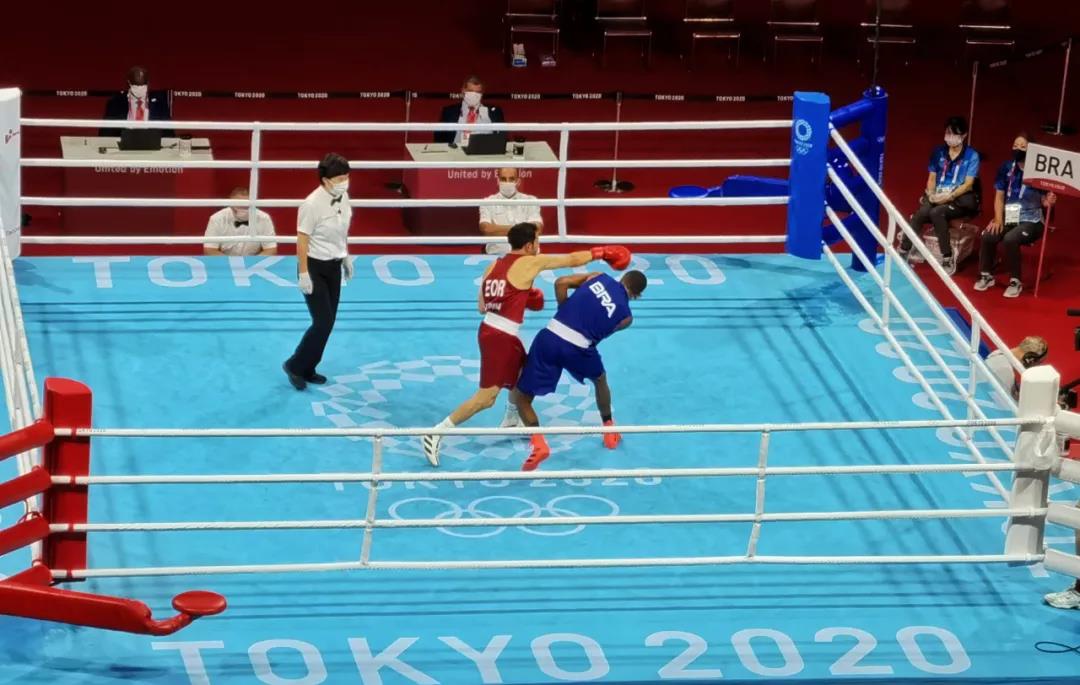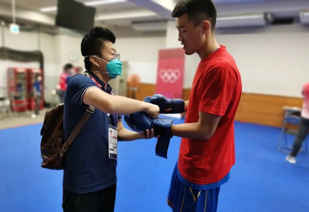 东京奥运会拳击热身馆,中国·金沙(js69认证)体育工作人员帮助运动员穿戴拳击手套